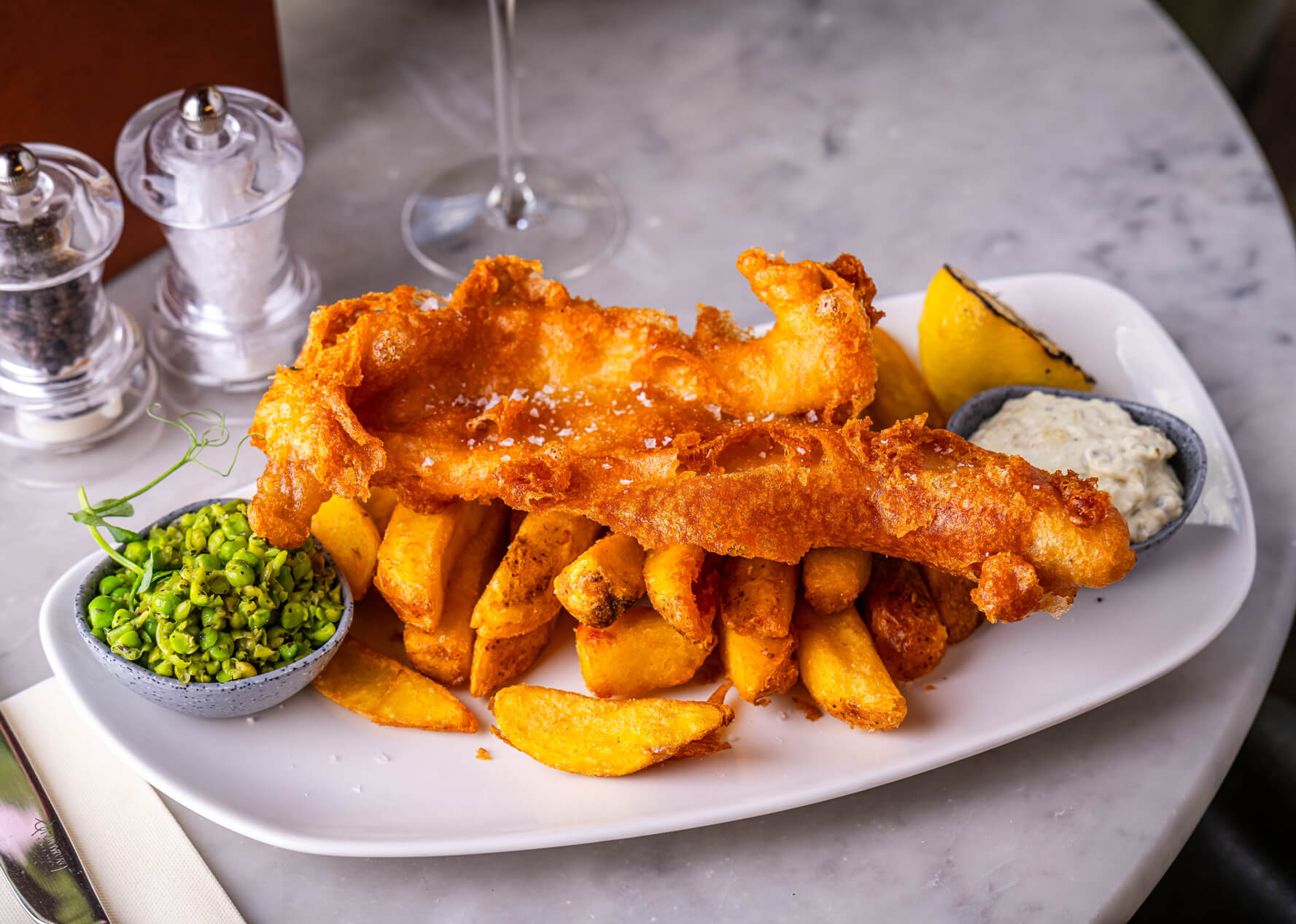 Enjoy two portions of our Traditional fish and chips for just £28, freshly battered haddock fillet served with thick cut chips, buttered crushed peas, tartare sauce & scorched lemon. It’s even gluten free!